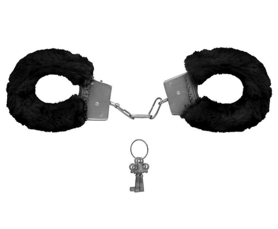 Algemas em metal com pelúcia. Acompanha chave e trava de segurança para soltar caso perca a chave.